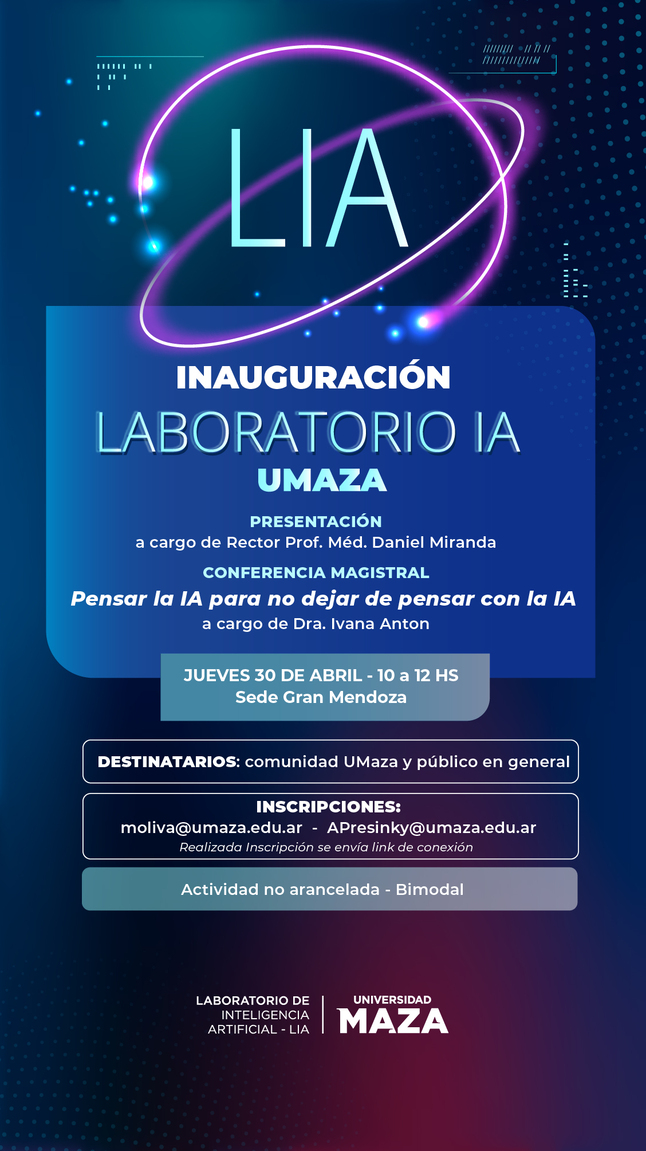 La Universidad Juan Agustín Maza invita a su comunidad a participar del lanzamiento del Laboratorio de Inteligencia Artificial (LIA), una iniciativa orientada a promover la capacitación y el uso de la inteligencia artificial en el ámbito universitario.