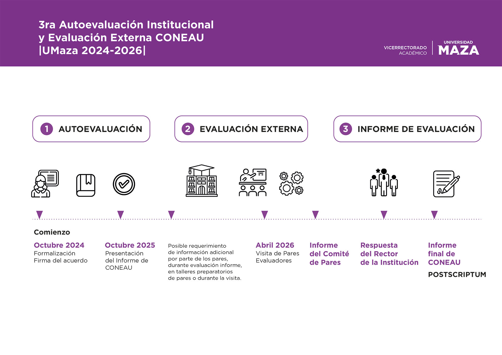 Para conocer más sobre el proceso de evaluación institucional, se puede consultar directamente en la oficina de Dirección Académica o el Vicerrectorado Académico, ubicados en el segundo piso del Edificio Huarpe de la Sede Gran Mendoza.
