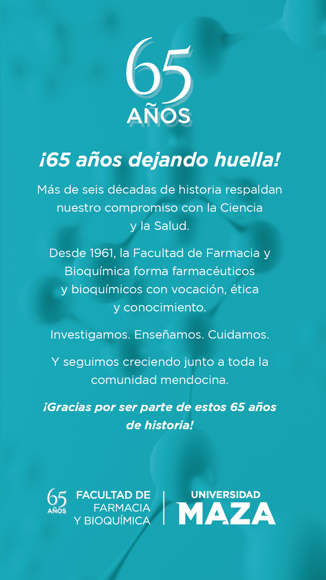 La Facultad de Farmacia y Bioquímica de la Universidad Maza celebra su 65º aniversario, destacando su compromiso sostenido con la formación en el ámbito de la salud, guiada por valores científicos, éticos y de responsabilidad social.